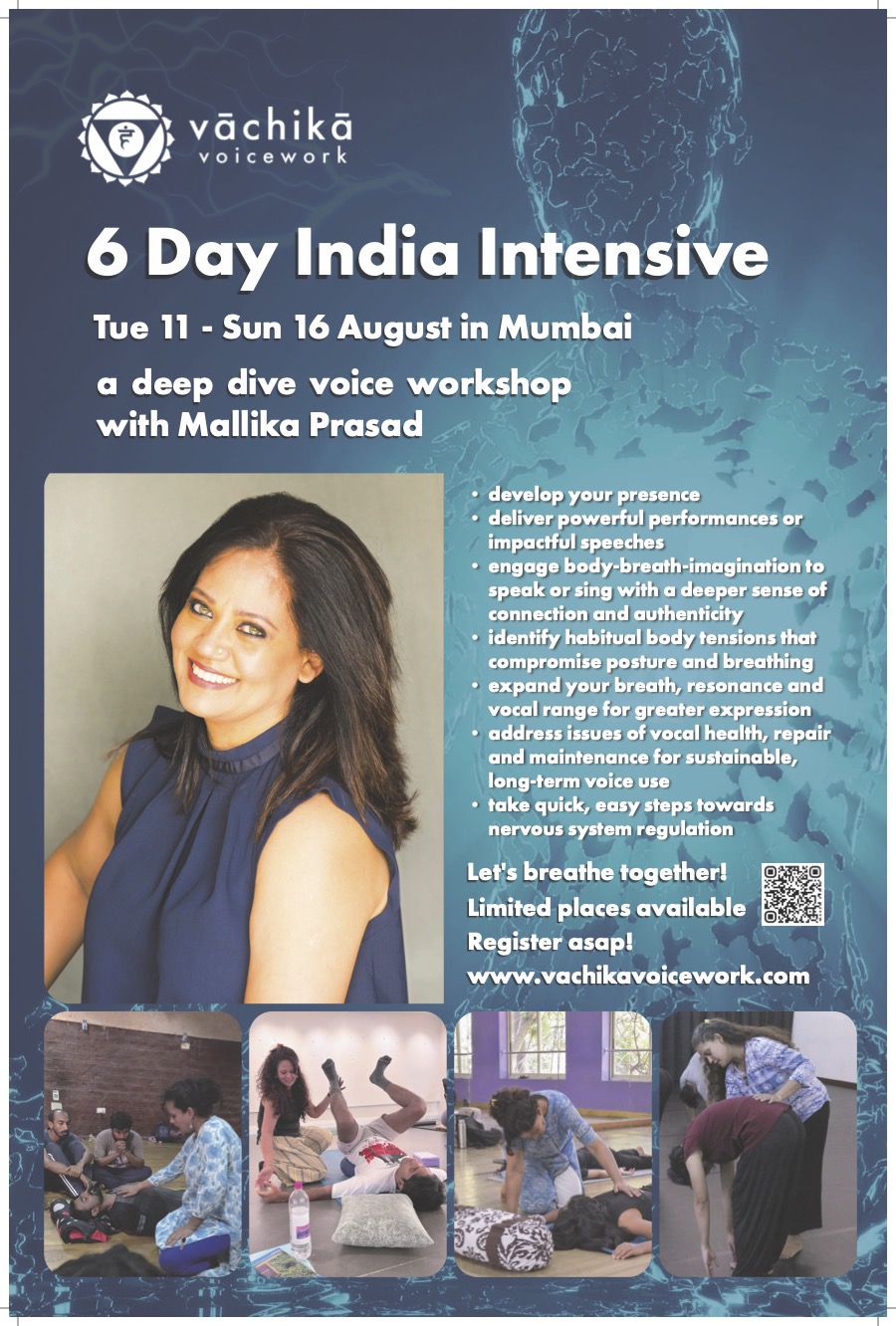 Mallika is the Founder/Developer of Vāchikā Voicework. The aim of Vāchikā Voicework is to help performers break unconscious response patterns, access freedom, well-being and spontaneity. She is a certified Associate Teacher of Fitzmaurice Voicework®.